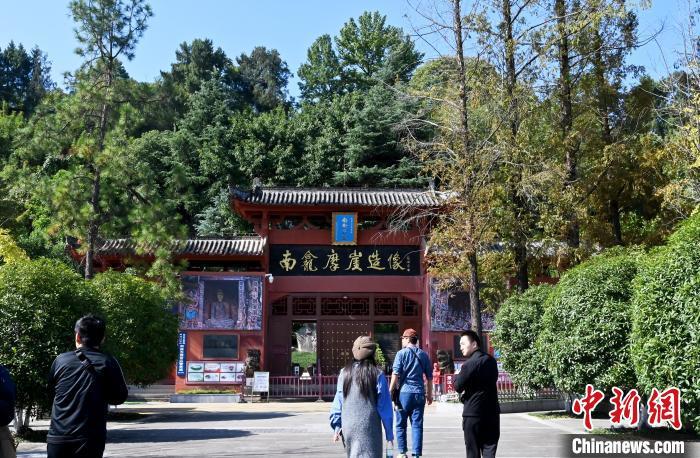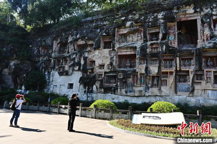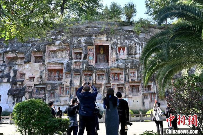 图为游客观看南龛摩崖造像。中新社记者 安源 摄