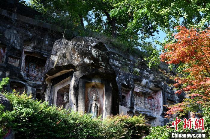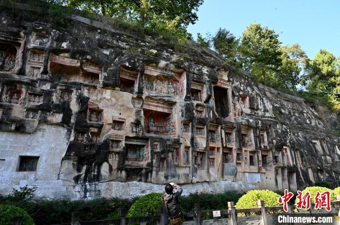 11月5日,记者跟随“发现新天府 行走古蜀道”摄影名家蜀道行采风活动走进四川省巴中市,探秘巴中南龛摩崖造像。南龛石窟是四川省巴中境内规模最大、保存最为完好的摩崖造像群,现存176龛,2700余尊,迄今已有1300余年,有着“盛唐彩雕全国第一”之美誉。摩崖造像大窟小窟、栉比相连,内容丰富,造型精美,是中国石窟艺术晚期发展巅峰具有代表性的佛教艺术。图为南龛摩崖造像106号窟。中新社记者 安源 摄