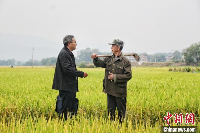 唐明贵(左)在田间与农户沟通交流。唐涛华 摄