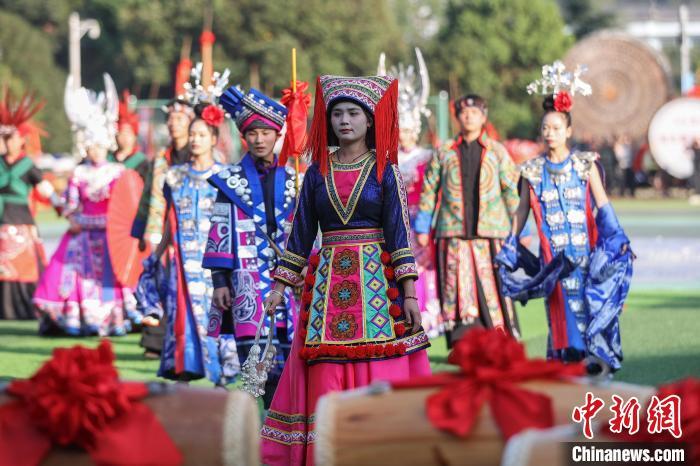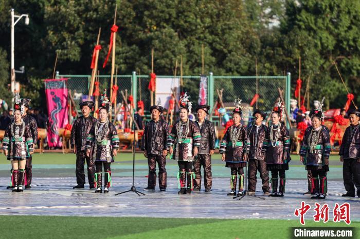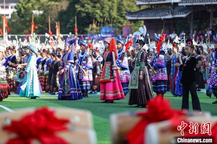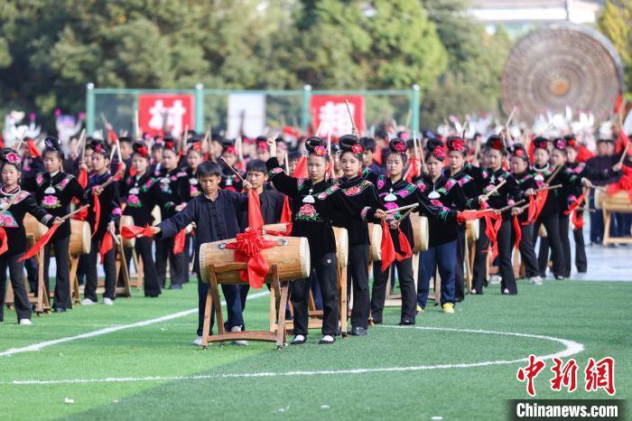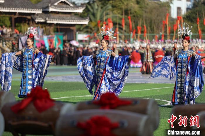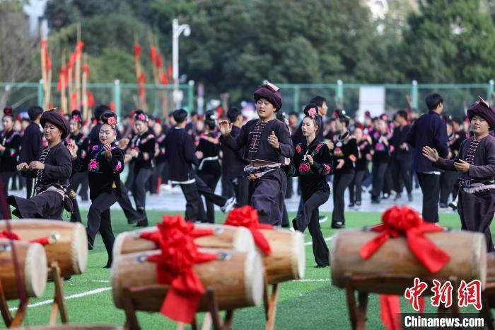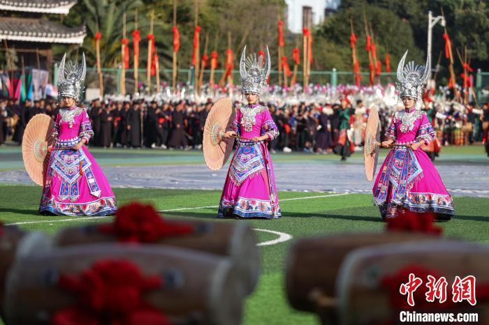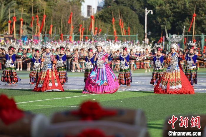 11月10日,2024中国·雷山苗年暨鼓藏节开幕,“盛世苗年·神韵鼓藏”大型民族歌舞展演在贵州省雷山县铜鼓广场举行。歌舞展演分为《鼓藏神韵》《银装闪烁》《盛世歌舞》《鼓舞奋进》四大篇章。图为第三篇章《盛世歌舞》演出。 记者 瞿宏伦 摄