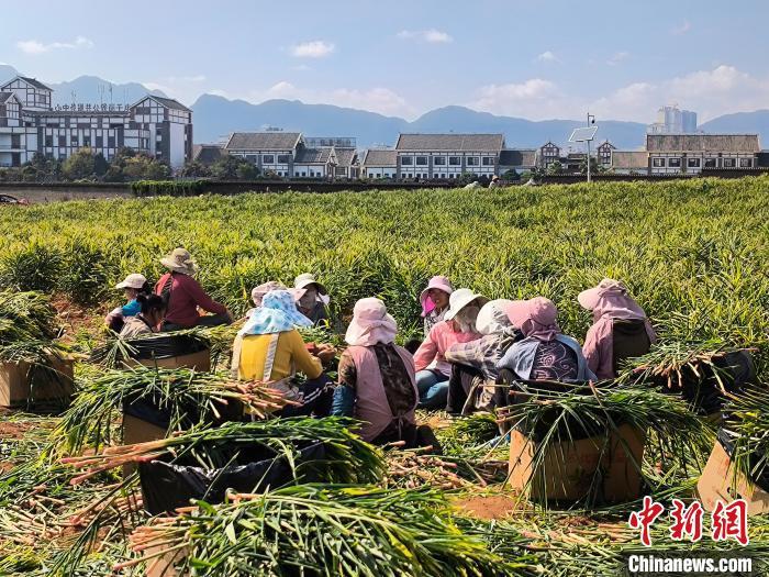 中新网曲靖11月13日电 (郝益旻)近日,云南省曲靖市罗平县腊山街道青草塘村小黄姜种植基地内,姜农们重复着拔姜、剪切、称重、装箱的动作,紧张有序地采收。