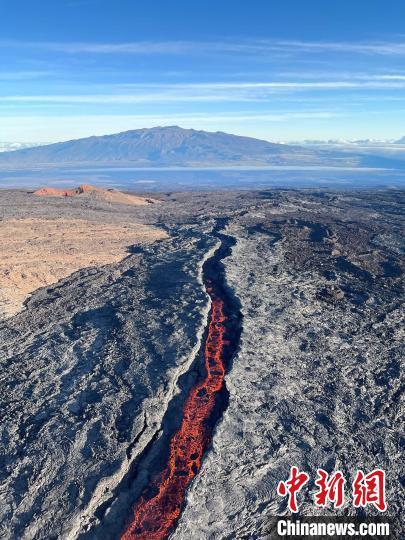从3号裂缝喷出的熔岩通道航拍图,该裂缝在莫纳罗亚火山东北裂谷区的高处喷发。美国地质调查局/供图