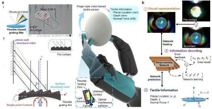 针对这一难题,研究团队受仿生结构色现象的启发,提出了一种基于柔性光栅结构色的触觉感知新方法,并结合深度学习算法进行数据处理,实现了接触点的高灵敏、高分辨率感知。