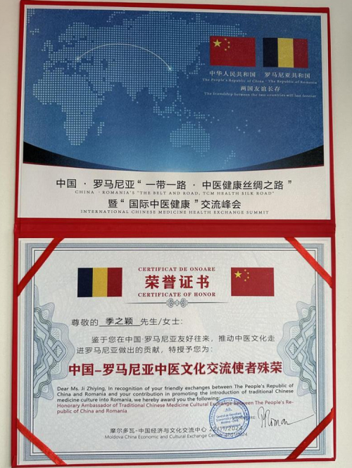 鉴于季之颖主任在中医文化交流方面所做出的杰出贡献,罗马尼亚前总理彼得·罗曼先生在峰会上亲自授予她“中国-罗马尼亚中医文化交流使者”的称号,并颁发了荣誉证书。彼得·罗曼先生表示,他深受季之颖主任的专业精神和敬业精神所打动,希望未来能够进一步加强中医药与罗马尼亚文化的融合,让更多的罗马尼亚孩子们感受到中医的魅力,摆脱疾病的困扰,茁壮成长。