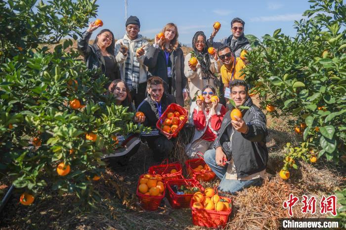 11月28日,正是赣南脐橙丰收时节,参加2024洋网红“Talk and Show江西”之赣南行活动的10余位“洋网红”先后走进位于江西赣州宁都县和瑞金市的两个万亩脐橙果园,现场体验采摘、宣传推介赣南脐橙,了解赣南脐橙种植背后的故事。赣州被誉为“世界橙乡”,是中国最大的脐橙主产区,2024年赣南脐橙种植面积达193万亩,预计产量将达到185万吨。图为“洋网红”们在江西省赣州市宁都县会同乡鹧鸪脐橙基地集体展示采摘的赣南脐橙。中新社记者 刘力鑫 摄