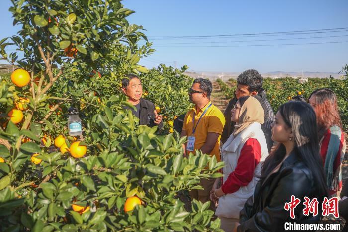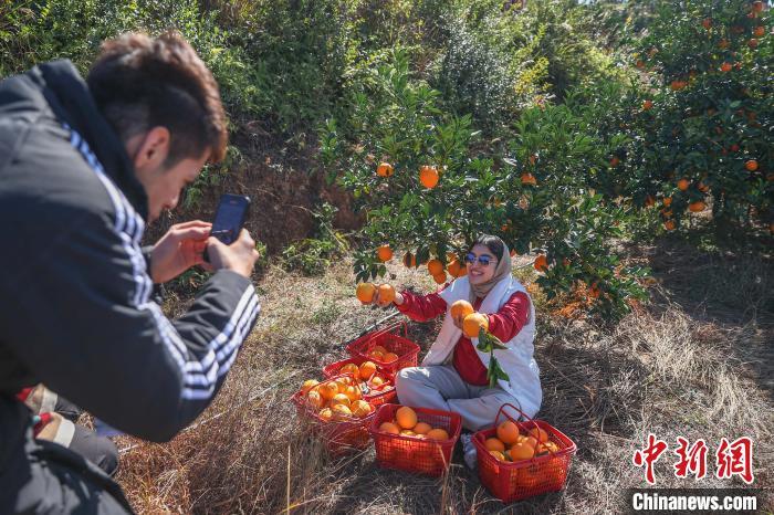 11月28日,正是赣南脐橙丰收时节,参加2024洋网红“Talk and Show江西”之赣南行活动的10余位“洋网红”先后走进位于江西赣州宁都县和瑞金市的两个万亩脐橙果园,现场体验采摘、宣传推介赣南脐橙,了解赣南脐橙种植背后的故事。赣州被誉为“世界橙乡”,是中国最大的脐橙主产区,2024年赣南脐橙种植面积达193万亩,预计产量将达到185万吨。图为来自巴基斯坦的“洋网红”乔木(图右)在江西省赣州市宁都县会同乡鹧鸪脐橙基地拍摄视频宣传推介赣南脐橙。中新社记者 刘力鑫 摄