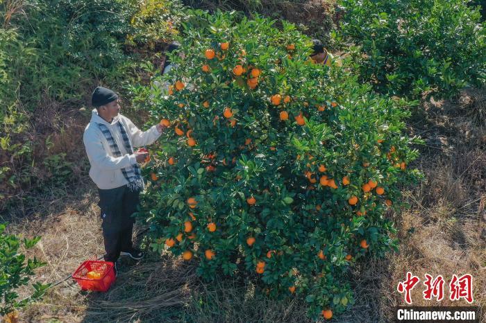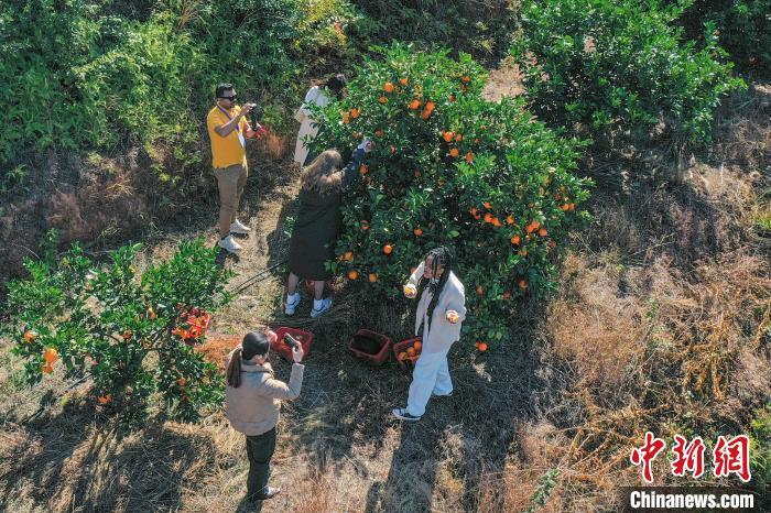 11月28日,正是赣南脐橙丰收时节,参加2024洋网红“Talk and Show江西”之赣南行活动的10余位“洋网红”先后走进位于江西赣州宁都县和瑞金市的两个万亩脐橙果园,现场体验采摘、宣传推介赣南脐橙,了解赣南脐橙种植背后的故事。赣州被誉为“世界橙乡”,是中国最大的脐橙主产区,2024年赣南脐橙种植面积达193万亩,预计产量将达到185万吨。图为“洋网红”们在江西省赣州市宁都县会同乡鹧鸪脐橙基地体验采摘。(无人机照片)中新社记者 刘力鑫 摄