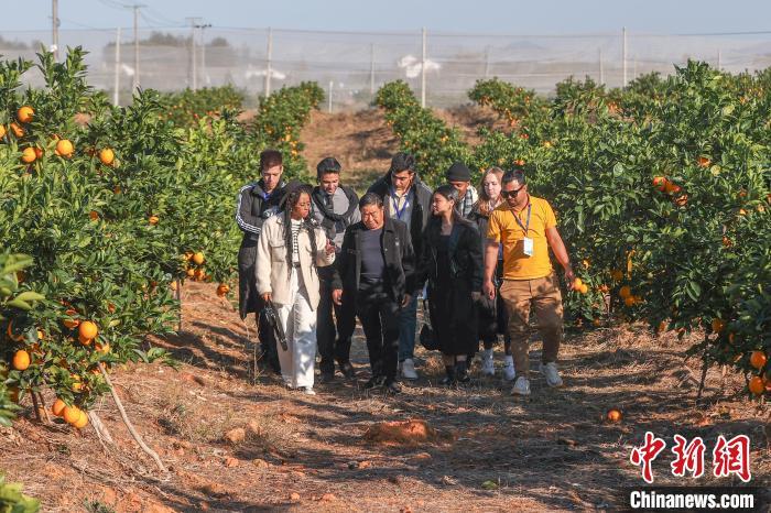 11月28日,正是赣南脐橙丰收时节,参加2024洋网红“Talk and Show江西”之赣南行活动的10余位“洋网红”先后走进位于江西赣州宁都县和瑞金市的两个万亩脐橙果园,现场体验采摘、宣传推介赣南脐橙,了解赣南脐橙种植背后的故事。赣州被誉为“世界橙乡”,是中国最大的脐橙主产区,2024年赣南脐橙种植面积达193万亩,预计产量将达到185万吨。图为“洋网红”们在江西瑞金市黄柏乡坳背岗万亩脐橙基地与当地果农邓大庆(图中)交流了解赣南脐橙种植背后的故事。中新社记者 刘力鑫 摄
