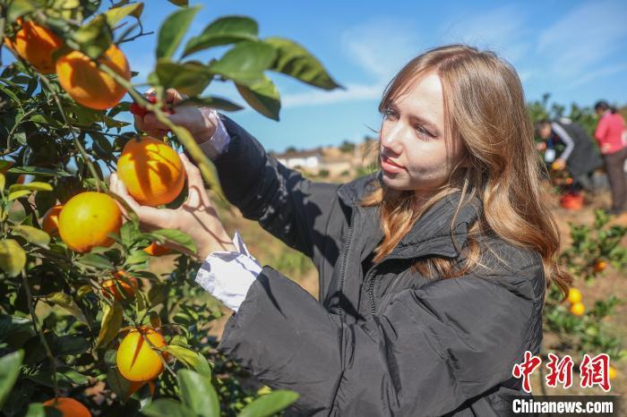11月28日,正是赣南脐橙丰收时节,参加2024洋网红“Talk and Show江西”之赣南行活动的10余位“洋网红”先后走进位于江西赣州宁都县和瑞金市的两个万亩脐橙果园,现场体验采摘、宣传推介赣南脐橙,了解赣南脐橙种植背后的故事。赣州被誉为“世界橙乡”,是中国最大的脐橙主产区,2024年赣南脐橙种植面积达193万亩,预计产量将达到185万吨。图为来自俄罗斯的“洋网红”达利亚在江西省赣州市宁都县会同乡鹧鸪脐橙基地体验采摘。中新社记者 刘力鑫 摄