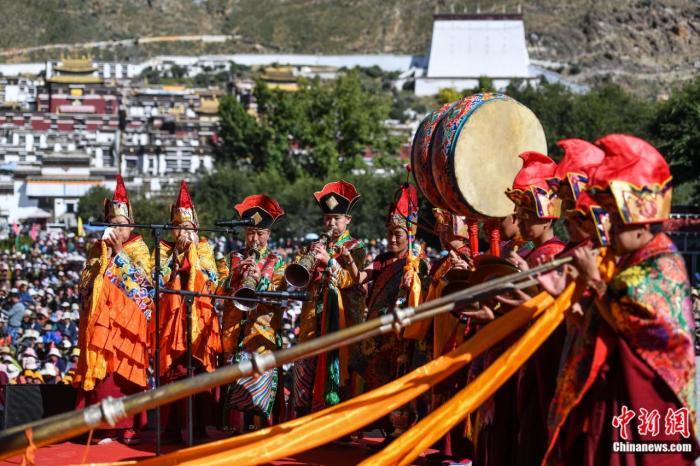 2019年9月25日,为庆祝中华人民共和国成立70周年,西藏藏传佛教界各教派僧尼500余人在日喀则扎什伦布寺广场举行传统“羌姆”表演和祈福活动,祈愿中国繁荣昌盛,国泰民安。中新社记者 何蓬磊 摄