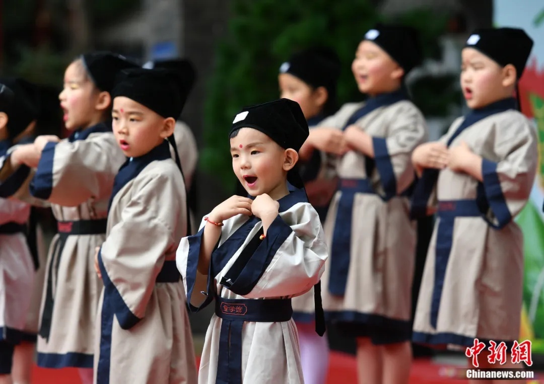 2018年6月16日,新疆乌鲁木齐市文庙举办主题活动,迎接中国传统节日——端午节的到来。图为一群萌娃上台咏诵《弟子规》。中新社记者 刘新 摄