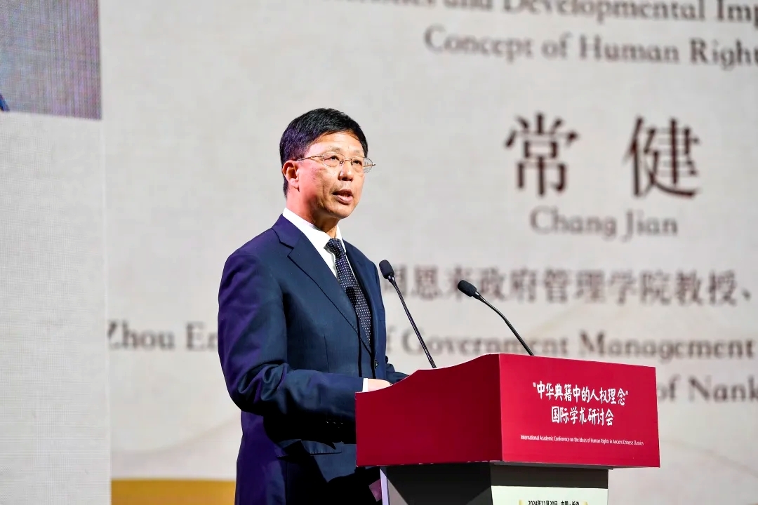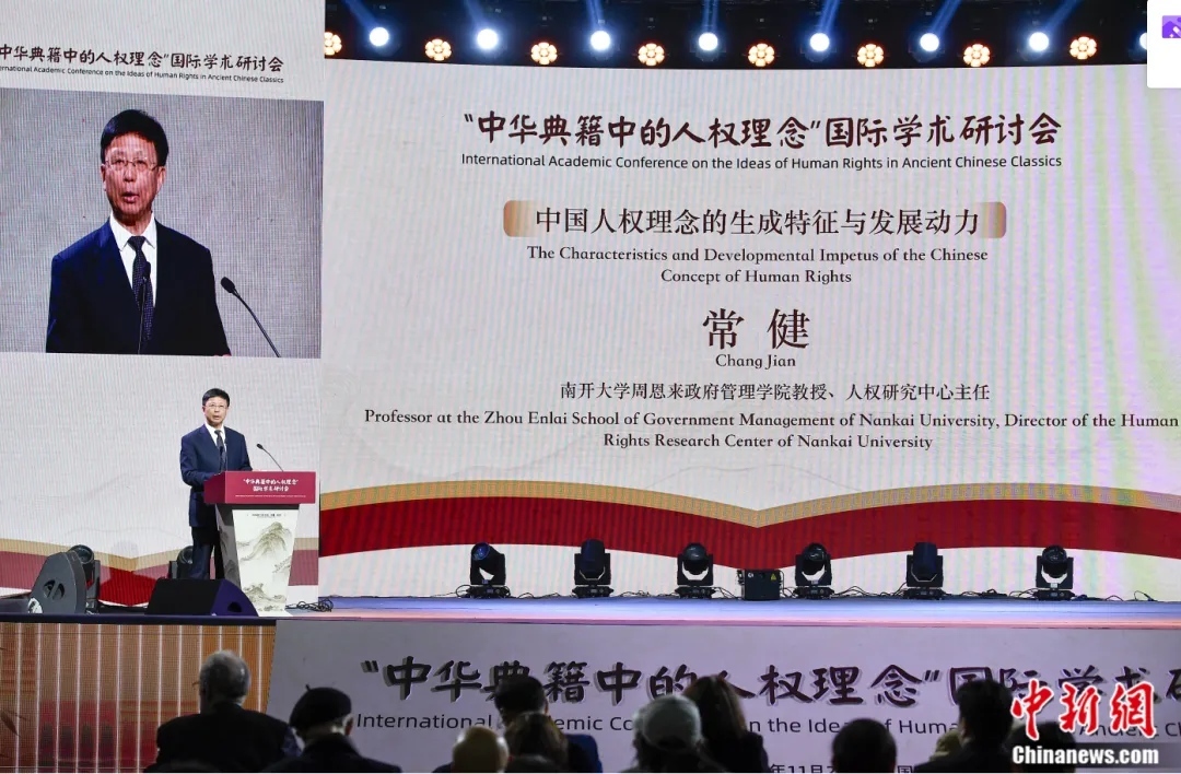 2024年11月18日至20日,“中华典籍中的人权理念”国际学术研讨会在湖南大学岳麓书院举办。图为常健在会上阐述观点。中新社记者 唐小晴 摄