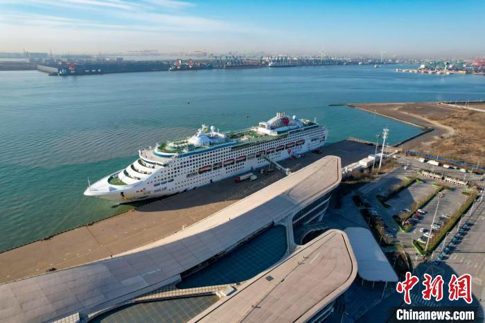 12月4日,随着“梦想号”邮轮汽笛长鸣、缓缓驶离,天津国际邮轮母港今年接待国际邮轮达到100艘次,累计接待进出境旅客超34万人次。图为“梦想号”邮轮停靠在天津国际邮轮母港。(无人机照片) 中新社记者 佟郁 摄