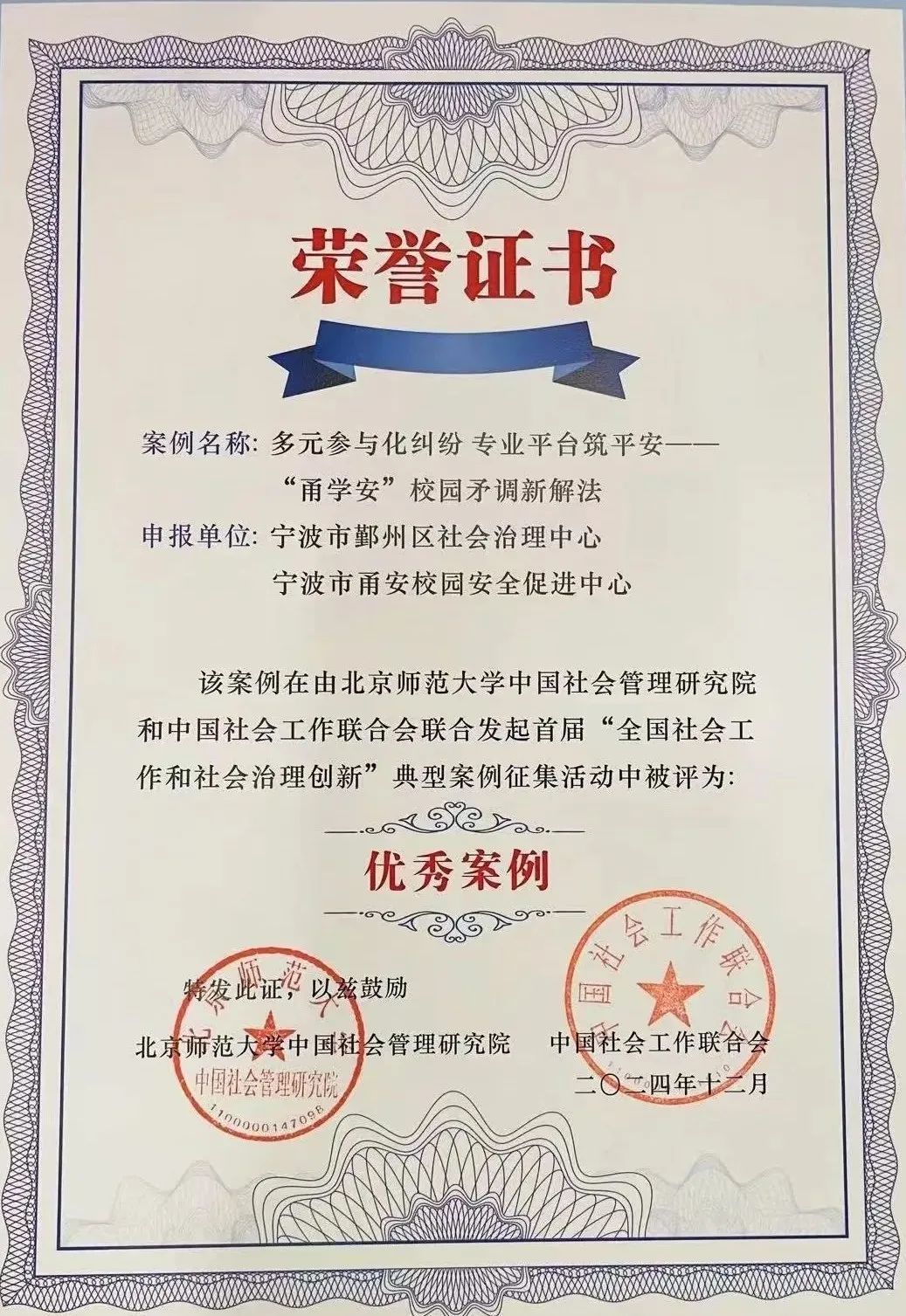 12月3日,第十三届中国社会治理论坛在北京举行。论坛上公布了首届全国社会工作和社会治理创新典型案例征集情况,由宁波市鄞州区社会治理中心和宁波市甬安校安全中心联合申报的《多元参与化纠纷 专业平台筑平安——“甬学安”校园矛调新解法》基层社会治理典型案例成功入选优秀案例,获得“国字号”荣誉。