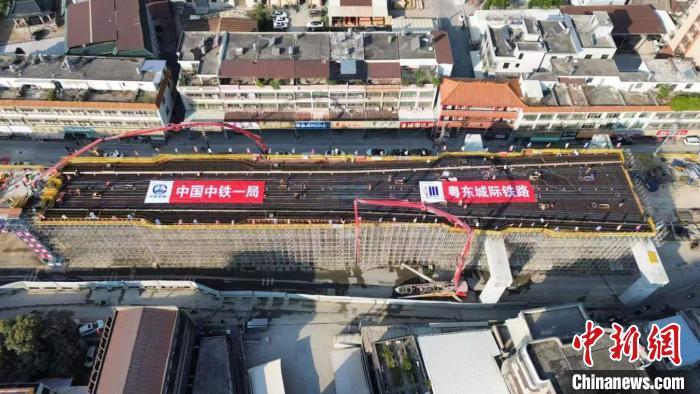 中新网广州12月9日电 (记者 蔡敏婕)经过连续18个小时紧张有序的施工,中铁一局承建的粤东城际铁路浮洋站第三联道岔连续梁浇筑近日完成,这是粤东城际铁路浮洋站的最后一联道岔连续梁,标志着项目顺利完成了全线首个车站的三联道岔连续梁。