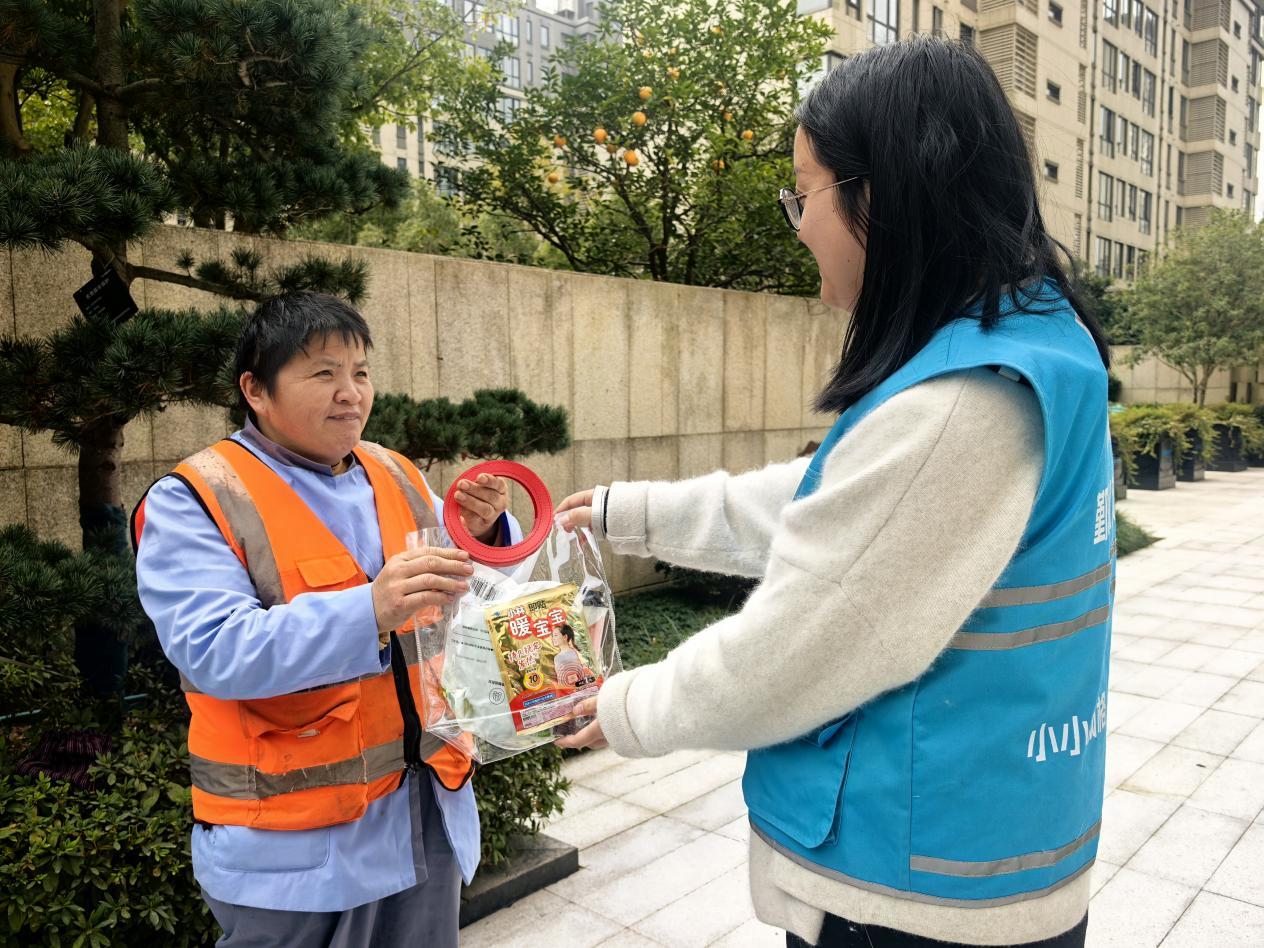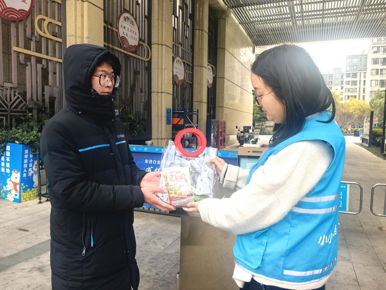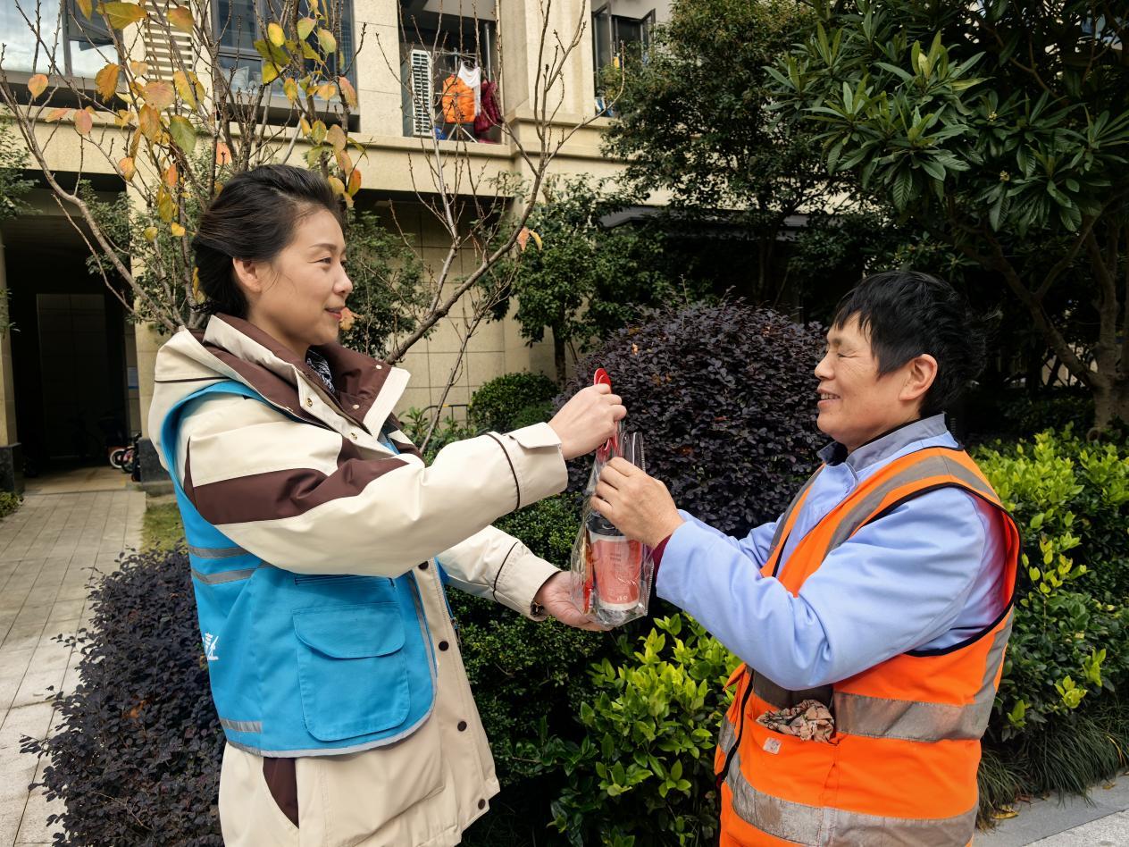 随后,网格员们分成多个小组,深入各个小区,将这份沉甸甸的温暖亲手送到一线工作人员的手中。美邸园小区的垃圾分类督导员柯小春接过礼包,脸上绽放出感激的笑容:“真是太感谢你们了!这么冷的天,还能想到我们,心里真是暖洋洋的。”她迫不及待地打开礼包,眼前的物品让她瞬间感受到了来自社区的温暖与关怀。其他同事也纷纷过来,感受着这份来自社区的关爱。“谢谢社区,谢谢你们!有你们这样的关心,我们干劲儿更足了!”另一位督导员张玉芬感慨地说。