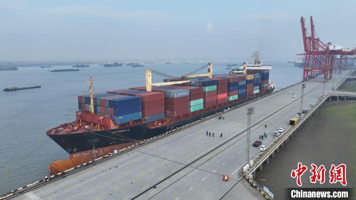 12月12日,巴拿马籍集装箱船“麦迪鸿伟”轮靠泊在南京港龙潭集装箱码头。 (南京海事局 供图)