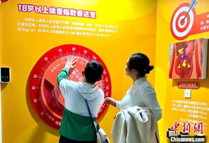 在展览体验区,观众还可自主翻阅“健康中国,你我同行”系列科普书籍,并在辅导员的引导下体验“健康体检一体机”,通过科技手段监测自身健康状况。“健康体重”主题展览还配套开展打卡活动和答题活动,鼓励观众利用互动装置,了解自己的健康状况,学会体重监测的科学方法。