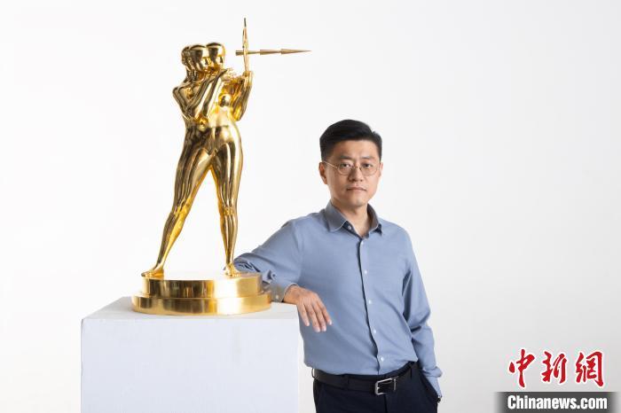 图为艺术家宿志鹏和获奖雕塑作品《首金》。
