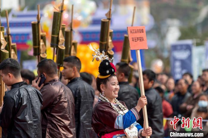 图为一位侗族姑娘在给参赛芦笙队举牌。吴德军 摄