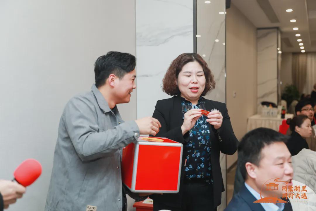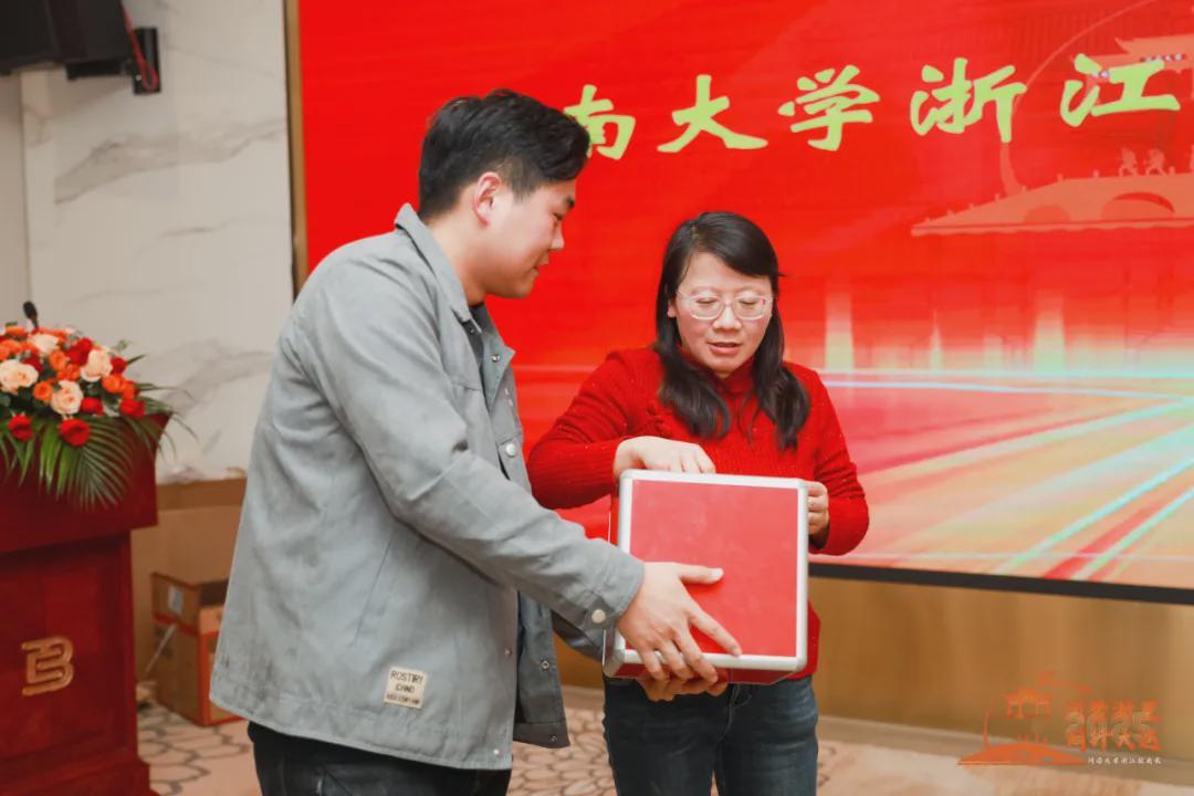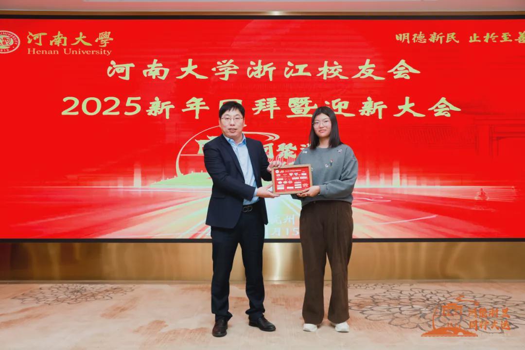河南大学浙江校友会常务副会长任刚要为新校友代表送徽章