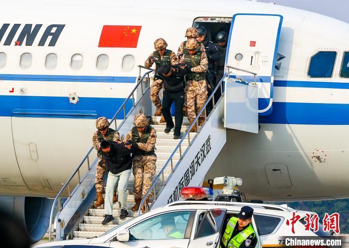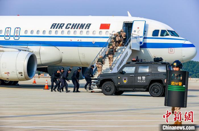 图为武警特战队员与公安特警队员联合进行处置“ 不法分子”暴起劫持旅客科目。中新社记者 张畅 摄
