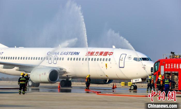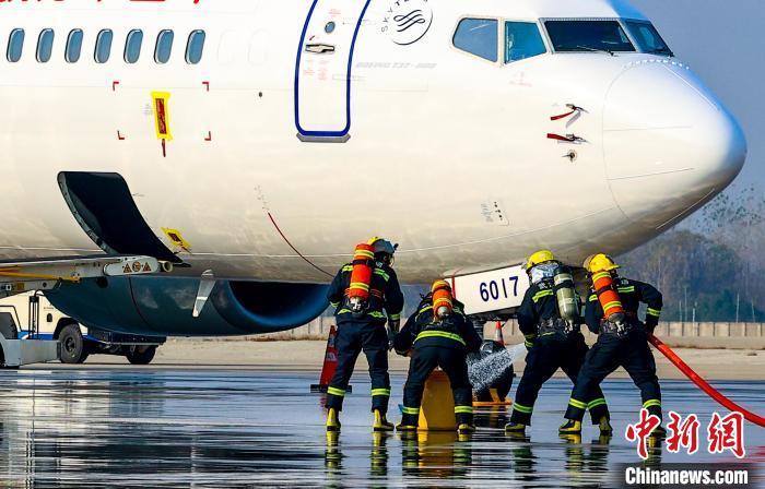 12月18日上午,武汉天河国际机场举行“奋进·2024”应急救援综合演练。演练共进行无人机反制、消防灭火救援、危险品处置、航空器非法干扰、家属援助、残损航空器搬移等6个应急救援处置科目,全方位检验武汉天河国际机场以及各应急救援保障单位应急处置能力和协调联动水平,进一步加强机场应急管理体系和能力建设。图为消防救援人员进行消防灭火救援演练。中新社记者 张畅 摄