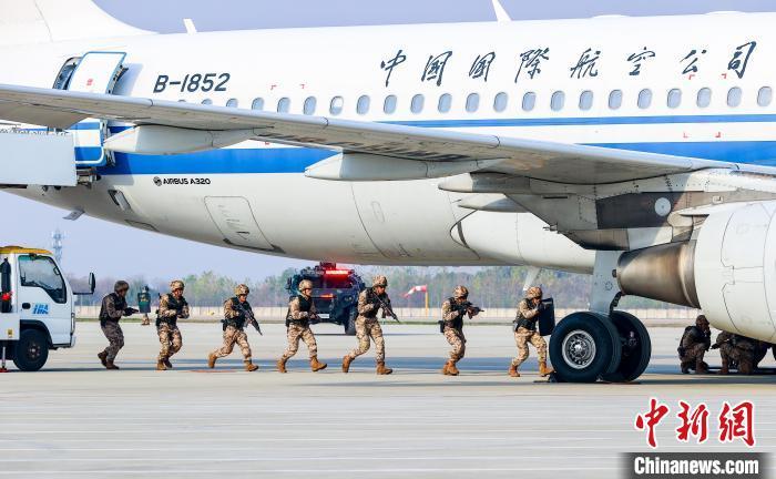 图为武警特战队员进行处置“ 不法分子”暴起劫持旅客科目。中新社记者 张畅 摄