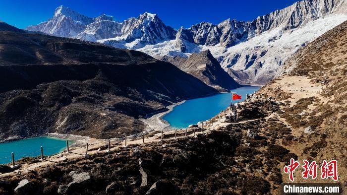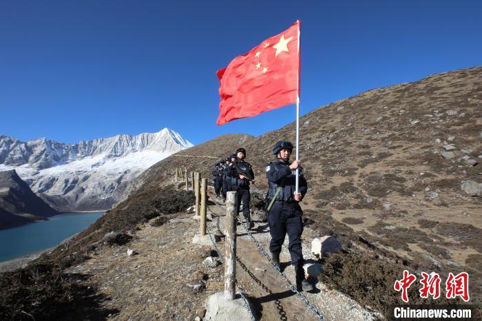 图为西藏出入境边防检查总站色边境派出所移民管理警察在边境辖区景点巡逻。郭远敬 摄