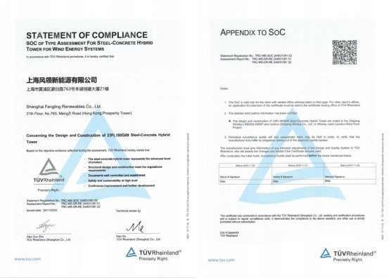 近日,上海风领新能源于江苏涟水项目中开发的钢-超高性能混凝土(UHPC)混合塔筒获得了型式认证证书(证书编号:23FL180G09)。