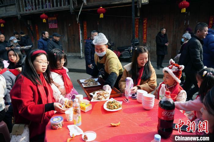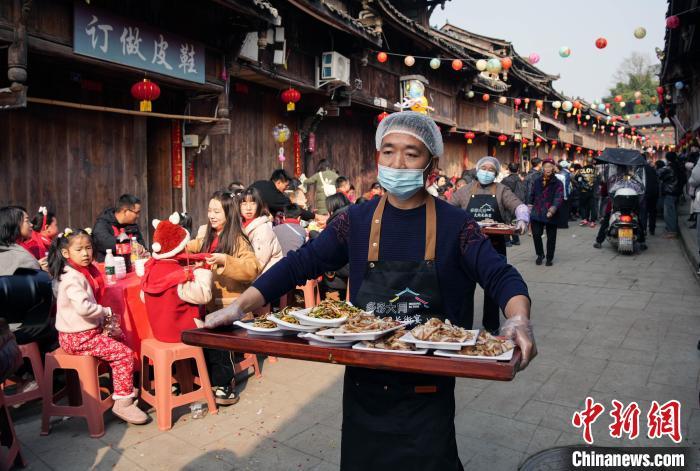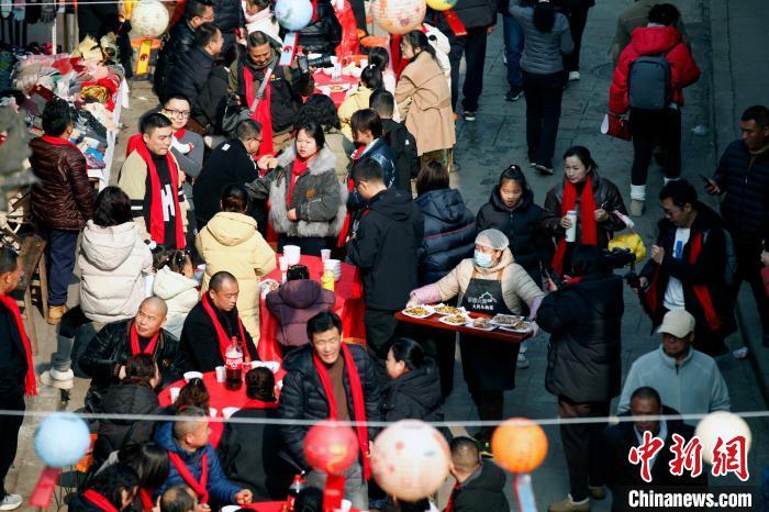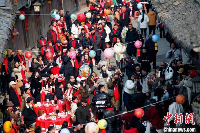 1月1日,四川省邛崃市大同古镇举办了一场热闹的年货节和长街宴。长街宴上,八十桌宴席沿街排列,形成了一条壮观的长龙,吸引了众多游客和市民参与体验。图为拍摄的长街宴场景。中新社记者 王磊 摄