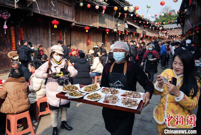 图为传菜师傅端着丰富的菜品吸引游客拍照。中新社记者 王磊 摄