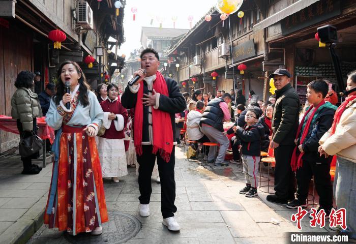 图为演艺人员在长街宴上献唱助兴。中新社记者 王磊 摄