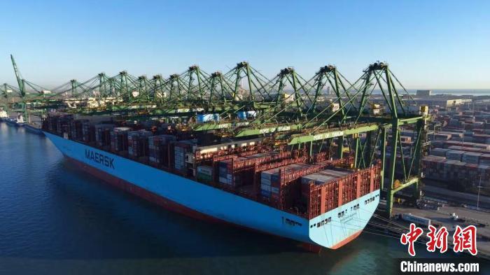 随着2M北欧Ⅱ线“莫斯科马士基”轮最后一根缆绳解离,太平洋国际公司以每小时506自然箱的在泊船时效率,刷新该航线的全球最高纪录。(天津港集团供图)