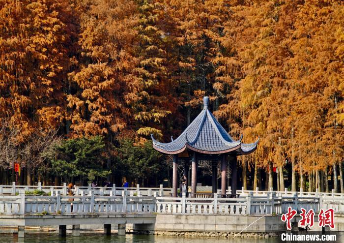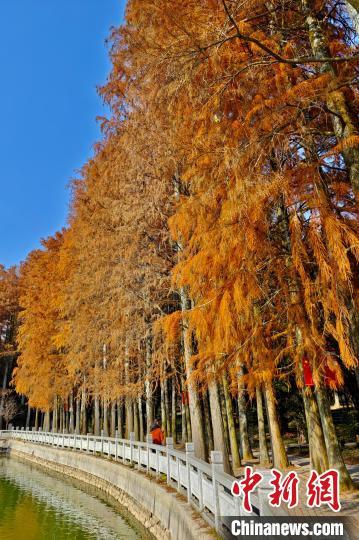 1月6日,游客观赏红色水杉林。近日,福州国家森林公园水杉林换上红色“新装”,成为冬日里一道别致的风景线。中新社记者 王东明 摄