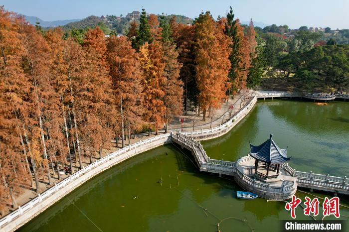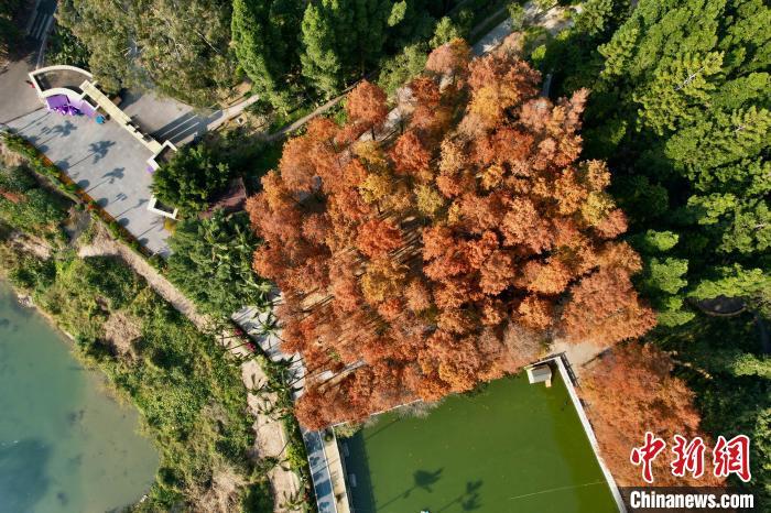 1月6日,空中俯瞰福州国家森林公园“换装”变红的水杉林,宛如大自然精心布置的调色板,成为冬日里一道别致的风景线。(无人机照片)中新社记者 王东明 摄
