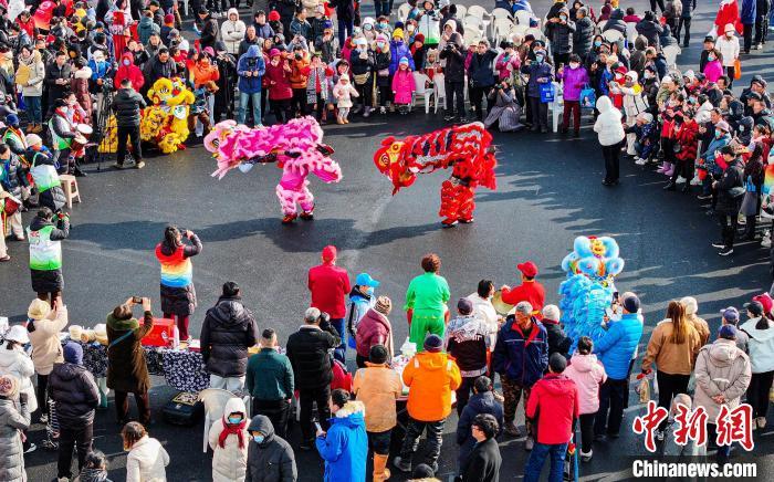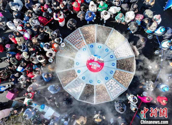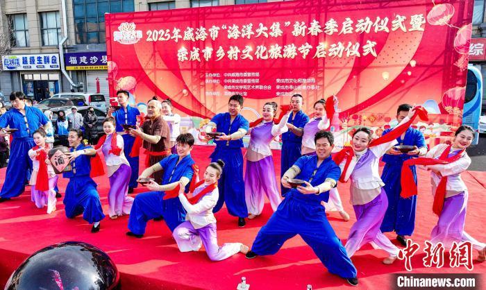 1月7日,在山东省荣成市,大量游客观赏渔家锣鼓、渔家秧歌、渔民号子等表演,并品尝丰盛的海鲜宴。连日来,“海洋大集”新春季活动在山东沿海等地启动,通过丰富多彩的表演与特色展示,展现山东海洋文化魅力。(无人机照片)李信君 摄