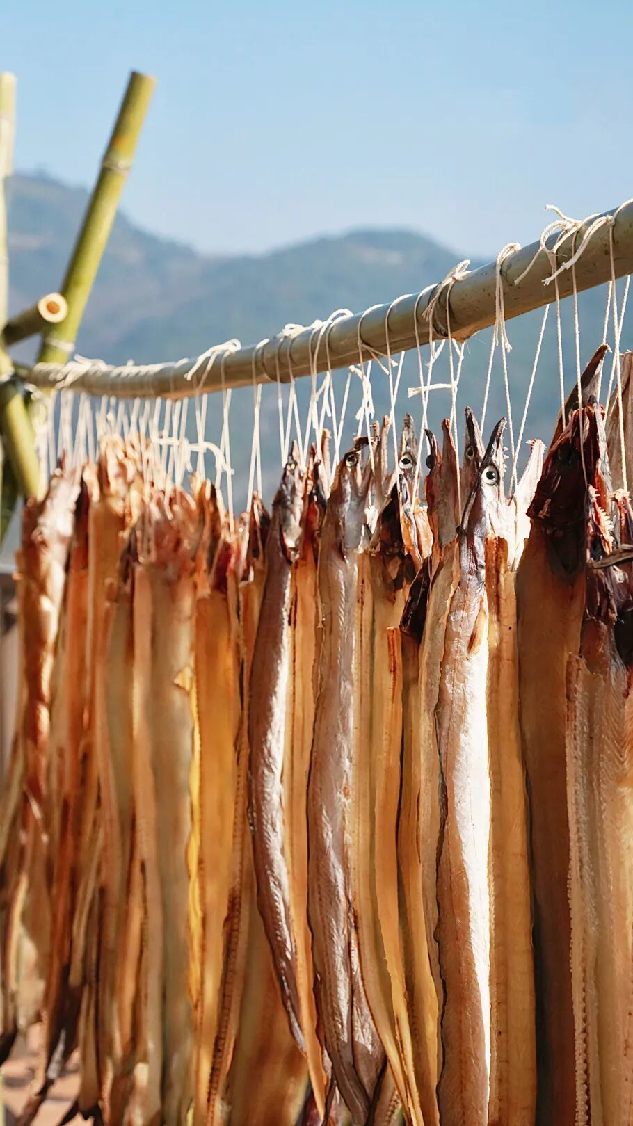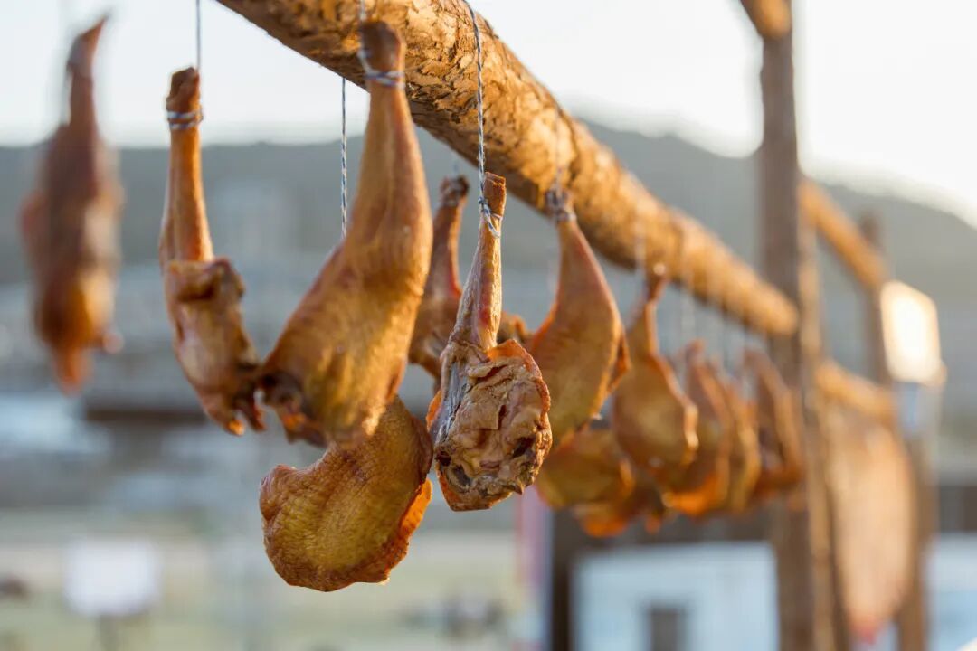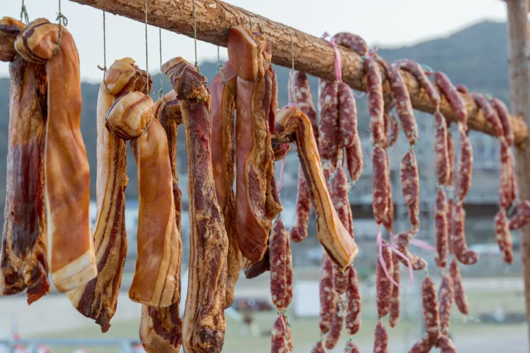一串串色泽金黄或暗红的鱼鲞、腊肉油光泛亮