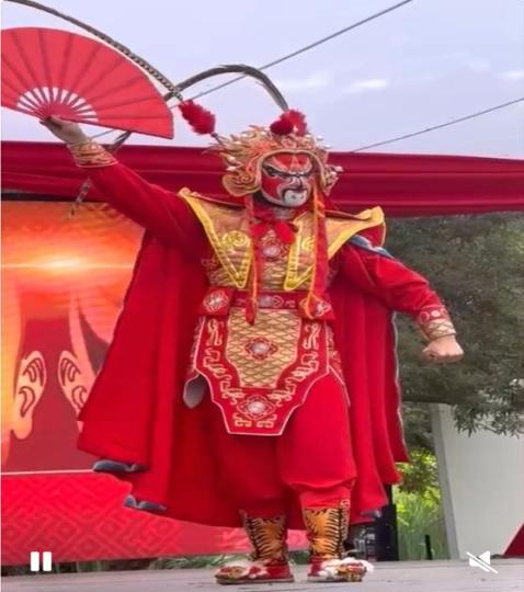 当地时间1月12日,智利首都“中国公园”里,巴西演员表演中国变脸艺术。 智利华助中心秘书处供图