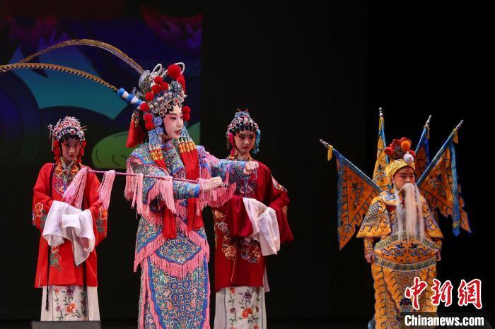 当地时间1月19日晚,以“金蛇戏舞梨园情”为主题的2025“欢乐春节”海外新年戏曲晚会在加拿大大多伦多地区列治文山市举行。图为当地梨园小弟子表演京剧选段联唱。 中新社记者 余瑞冬 摄