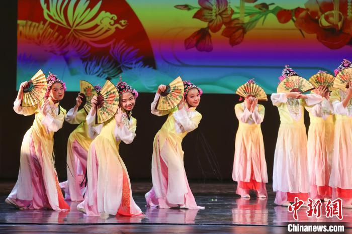 当地时间1月19日晚,以“金蛇戏舞梨园情”为主题的2025“欢乐春节”海外新年戏曲晚会在加拿大大多伦多地区列治文山市举行。图为当地文艺团体的小演员表演舞蹈《粉墨春秋》。 中新社记者 余瑞冬 摄