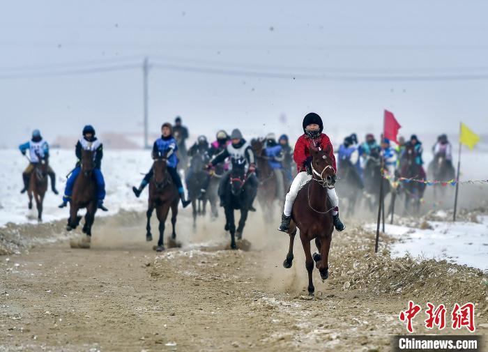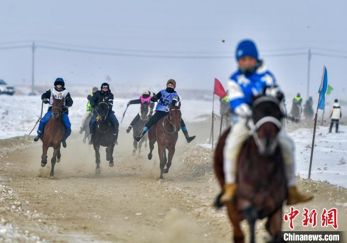 1月19日,新疆福海县,骑手策马扬鞭参加赛马活动,上演速度与力量的较量。该赛马活动根据参赛马匹年龄设三个项目,比拼赛马的速度、耐力及骑手的驾驭能力。中新社记者 刘新 摄