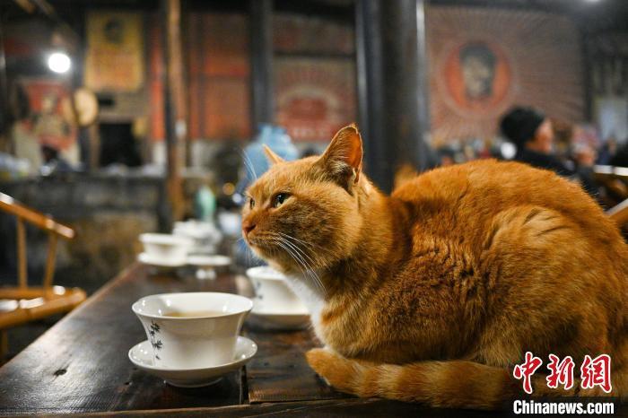 1月22日,四川成都,观音阁老茶馆内桌子上小憩的猫。中新社记者 刘忠俊 摄