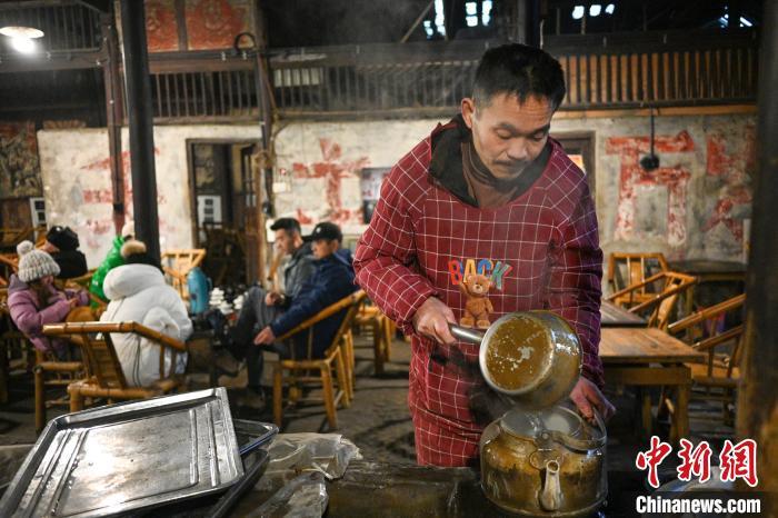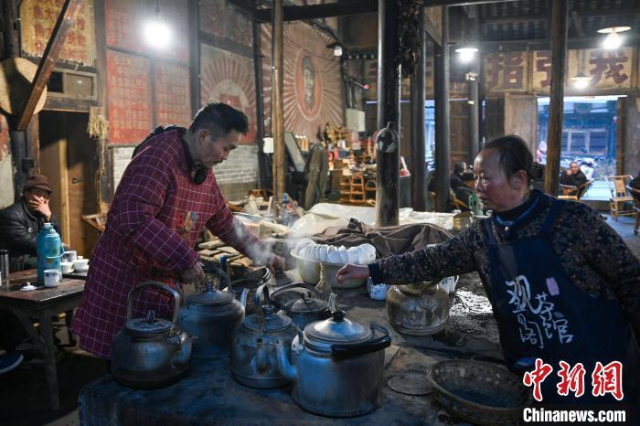 1月22日,四川成都,茶馆服务人员为烧水壶加水。中新社记者 刘忠俊 摄