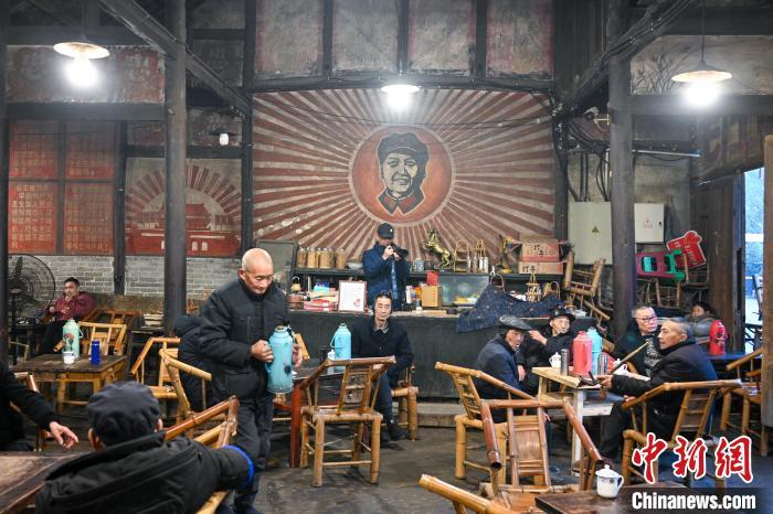 1月22日,四川成都,观音阁老茶馆一角。位于成都市双流区彭镇杨柳河畔的观音阁老茶馆内,不少小镇人或游客聚集一起喝茶、下棋和闲聊。观音阁老茶馆其原址是一座观音庙(止水庵),民国时期改为茶馆,距今已有100多年历史。走进观音阁老茶馆,简单的木瓦石灰泥墙,典型的川西式平房,木梁木柱木门木窗破旧。茶馆内虽有灯,但还是显得昏暗。陈旧的“老虎灶”台上摆放着烧水壶,旁边还有不少泡茶的杯子,硬土地面凹凸不平,尽显老茶馆的沧桑岁月。观音阁老茶馆被列为成都市第五批历史建筑保护名录,2024年获联合国教科文组织亚太地区文化遗产保护奖优秀奖