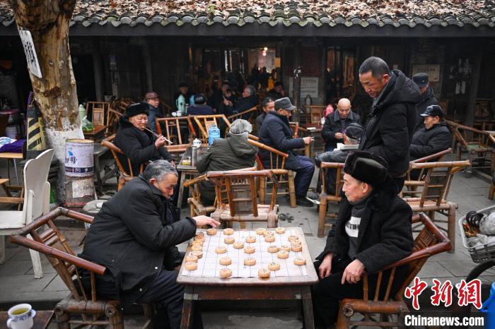 1月22日,四川成都,观音阁老茶馆外老茶客边品茶边下棋。中新社记者 刘忠俊 摄