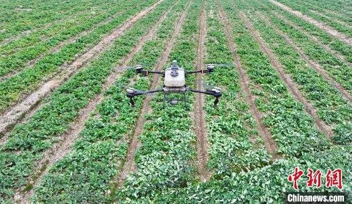 图为南昌市新建区联圩镇油菜高产示范基地内,无人机正在施肥。 贺登毅 摄