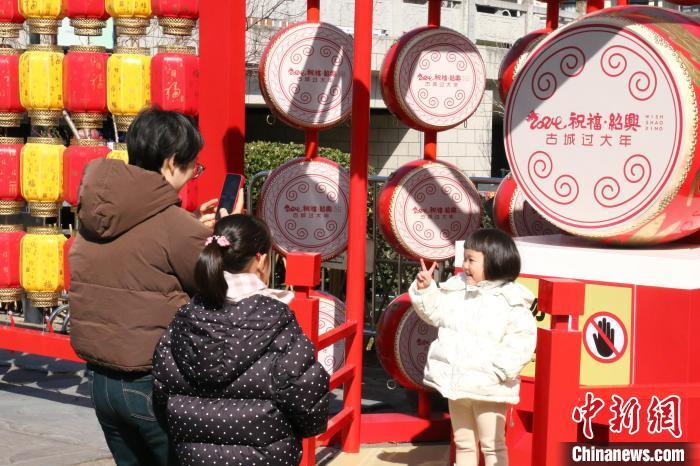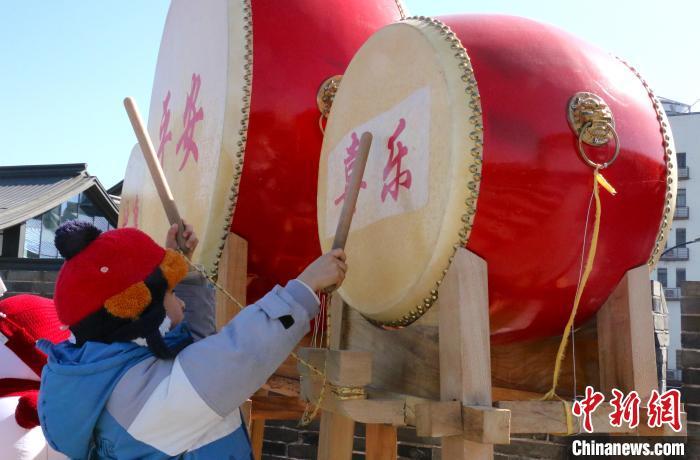1月27日,儿童在城墙上击鼓祈福。随着春节临近,浙江绍兴古城内张灯结彩、年味十足。中新社记者 项菁 摄