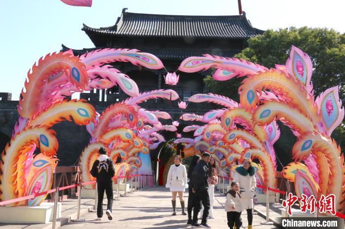 1月27日,游客在喜庆的装置前留影。随着春节临近,浙江绍兴古城内张灯结彩、年味十足。中新社记者 项菁 摄