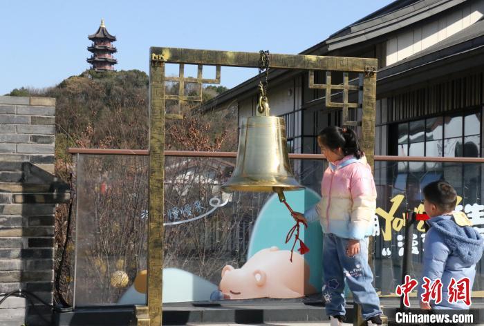 1月27日,儿童在城墙边敲钟祈福。随着春节临近,浙江绍兴古城内张灯结彩、年味十足。中新社记者 项菁 摄